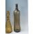 A collection of retro vintage coloured glass bottles / vases to include two Genie style bottles one having stopper to the top, a brown glass vase of moulded tapering form, a blue glass bottle with crest to front and a smokey glass bottle vase of reeded form. 5 in total. Tallest item measures 49cm high.