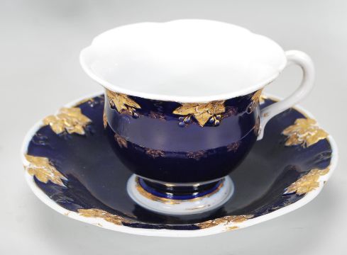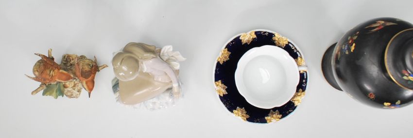 A collection of 20th Century ceramics to include a 1930's Carlton Ware lidded baluster vase having a black ground with floral sprays throughout, a Capodimonte bird figurine group, a Lladro figurine in the form of a lady sat on a rock with a fish and a Meissen cobalt tea cut with gilt vine leaf decoration to the rims together with a matching saucer.  Tallest item measures 27cm high.