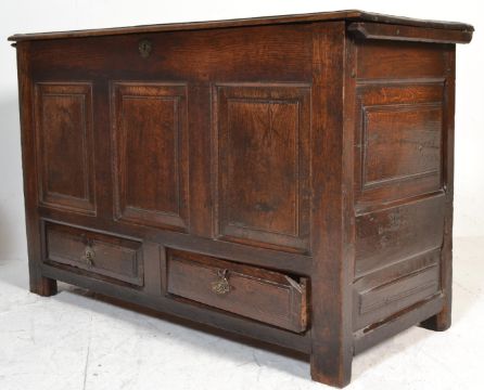 A 17th century carved oak large mule chest coffer being raised on stile supports having two short drawers beneath fielded panel sides and front. Above having hinged top over storage set within. Dimensions are 87cm x 132cm x 56cm.