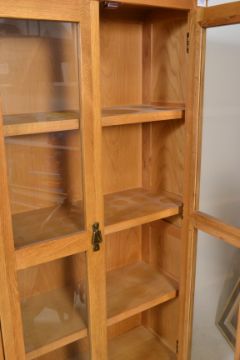 A good quality contemporary oak upright large display cabinet raised on squared legs having twin glazed full length panel doors with shelves inside. Chunky oak top above. Matching sideboard and table and chairs  in lots  1108 & 1110. Measures 180cm high by 90cm wide by 38cm deep.