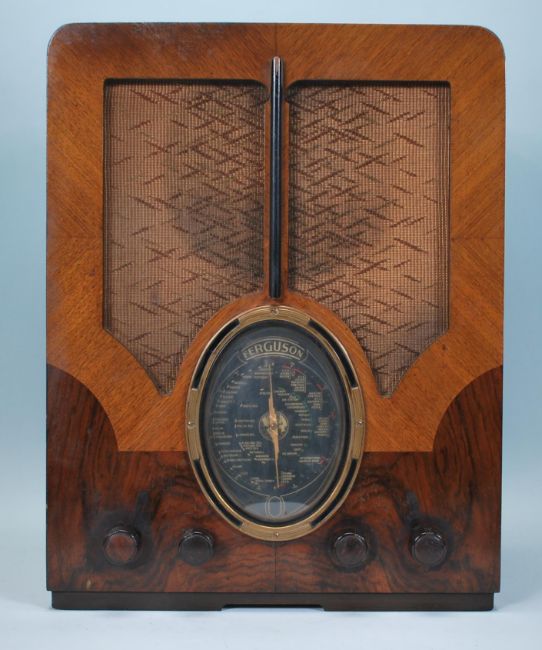 A 1930's Art Deco walnut two tone 4 valve radio. Of upright form having decorative walnut two tone case with good facia and dials. Makers name and plaque verso model 501AC
