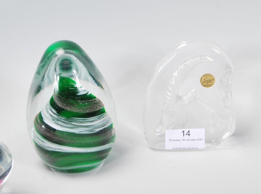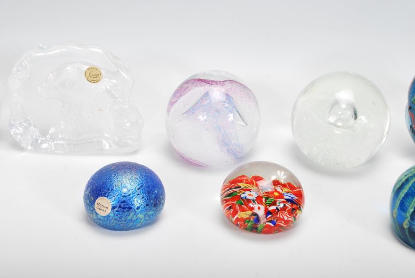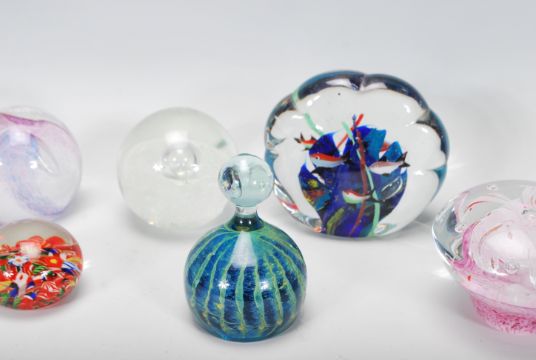 A group of 20th Century studio glass paperweights to include examples from Mdina, Heron Glass, multiple by Cristal D'Arques etc.Varying designs to include control bubble, swirl, iridescent, one decorated with fish etc. Biggest measures 12cm tall.