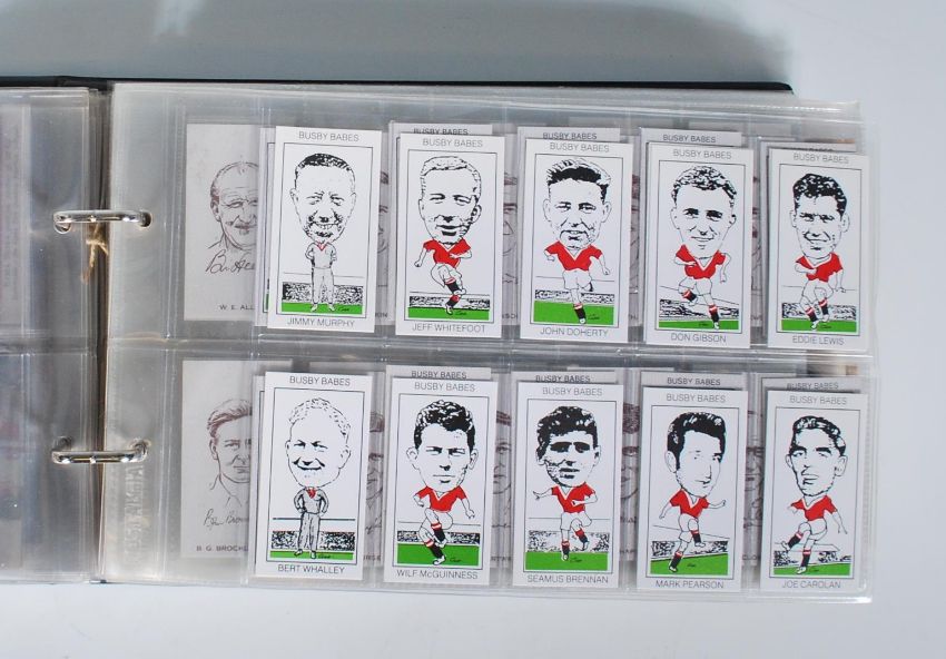 A collection of vintage 20th Century trade cards in full sets stored within plastic sleeves within an album. Sets include football program cards, Cricket Picture Cards For Collectors, Bridgewater Movie Stars cards series 1 and another set, Jiffi Kamasutra 64 in total, Unforgettables (football), Busby Babes West Midlands Collectors Centre, Somerset County Championship Cricket Series 1 and 2, Cow & Gate Malted Milk cards, British Birds And Their Nests, National Pets Doctor Teas, World War I Series 4 by Turcards, This Year's Top-Form Footballers The Rover paper, Famous Escapes Mars Confections, Wild Animals Horniman's Tea, Pets Horniman's Tea and Dogs Horniman's Tea.