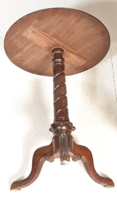 A 19th century George III dense solid mahogany tripod wine table. Raised on splayed legs with ball carved finial embellished detailing, spiral twist column to circular table top above. Measures