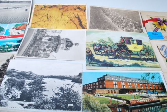 A collection of vintage postcards dating from the early 20th Century to include WWI silk postcards from the the same Soldier to his wife and daughter, military cards etc