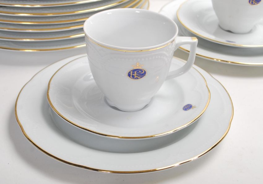 A large German Graf Von Henneberg Regina Katherina pattern tea and dinner service having a white ground with gilt rims and raised scalloped detailing, comprising plates, side plates, tea cups, saucers, sauce boat etc.