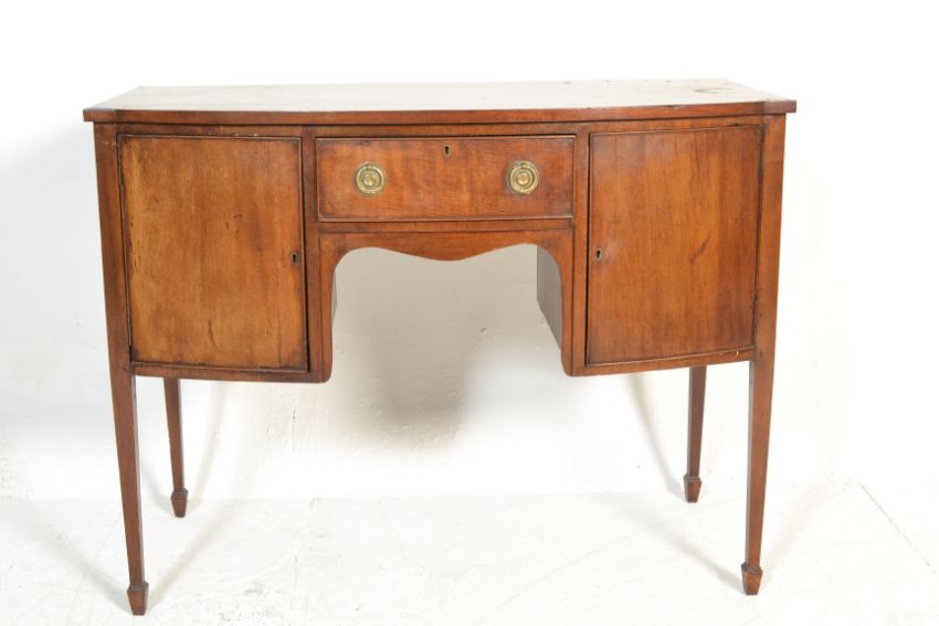 A 19th century Georgian mahogany bow small proportion sideboard raised on square tapering legs with spade feet. Above, with 2 end cupboard flanking a central drawer over kneehole recess.  Measures 91cm high x 118cm wide x 59cm deep.