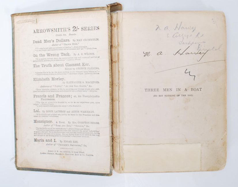 Three Men In A Boat leather bound book by Jerome K. Jerome. Illustrations by A. Frederics. Published by J. W. Arrowsmith, II Quay Street, London Simpkin, Marshall, Hamilton, Kent & Co, Limited 1889. (A/F)