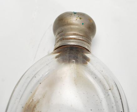 Two early 20th Century antique pocket flasks to include a glas bottle of ovular form with a white metal screw cap in leather puch and a crocodile leather bound bottle with a silver white metal cap. Largest measures 11cm high.