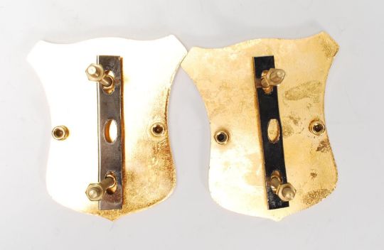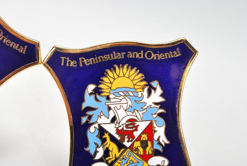 Two Peninsular and Oriental Steam Navigation Company car badges of armorial form having blue enamelled badges with crests and screw fixtures to verso. Measures 10cm high.
