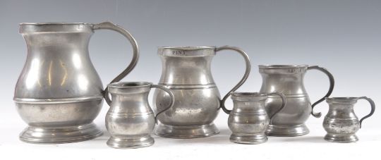A collection of six early 19th Century graduating pewter pot belly liquid measures, each having round foot, bulbous body, shaped handle and raised rims. Mostly stamped City Of Bristol with other various touch marks. Largest measures; 16cm.