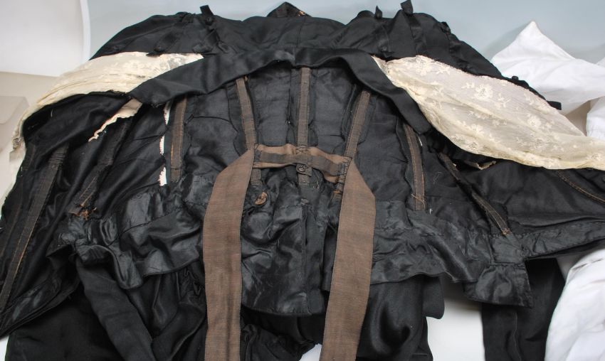 A 19th Century Victorian mourning dress / down consisting of bodice with white lace trim and button fastening, interior marked Mrs J S Brown Brighton House Derby Rd, and full length skirt. Together with a Victorian white linen night dress shift.