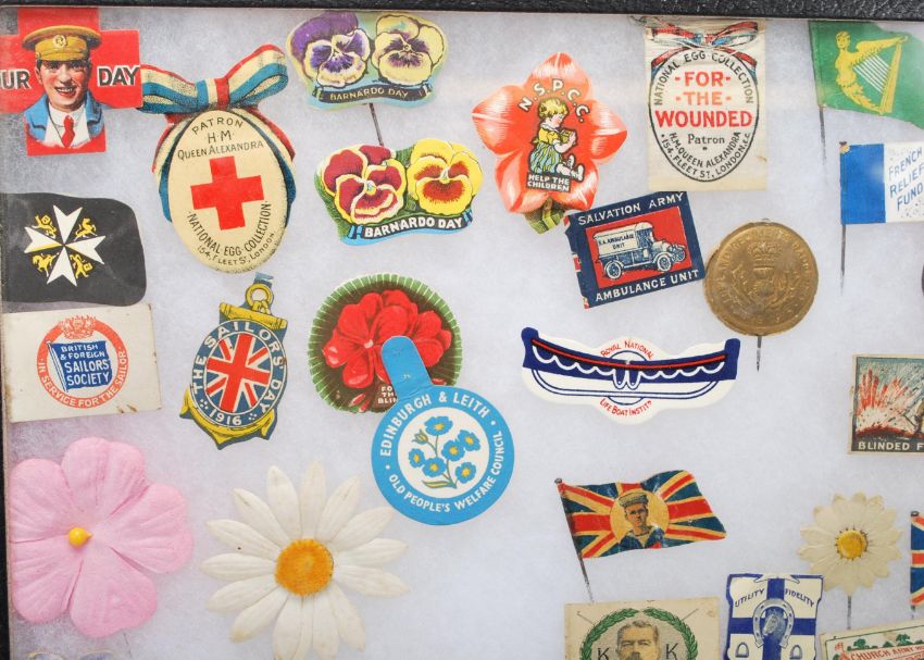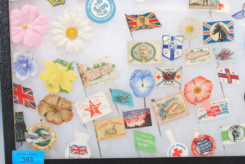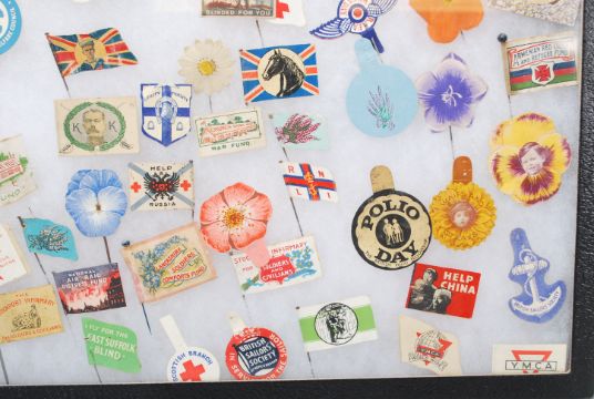 Lapel Pins - Mainly charity pins dating from the early 20th Century containing a large amount of military, to include HM Queen Alexandra National Egg Collection, National Air Raid Distress Fund, United We Stand, RSPCA War Fund, French Relief Fund, Church Army Hut war Fund, Blinded For You, Armenian Red Cross And Refugee Fund, I Fly For The East Sussex Blind etc. All mounted within a display case.