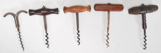 A group of cork screws dating from the 19th Century to include turned examples, a rosewood handled Georgian cork screw, one stamped for 'Wine Merchants Stokes & Harvey Ltd etc. Biggest measures 16cm long by 10cm wide.
