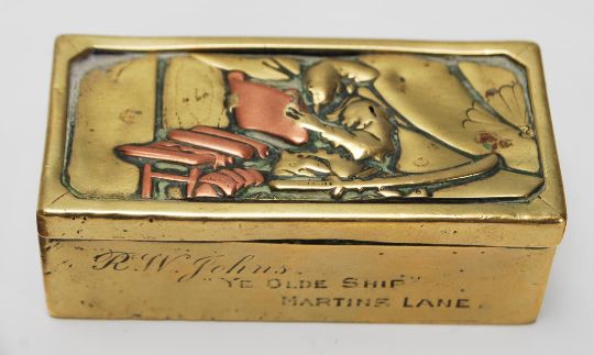 A group of three 20th Century snuff / pill pots to include a heavy brass rectangular example having a embossed worrier atop the lid reading a scroll, with inscription to front reading 'R.W. Johns "Ye Olde Ship" Martins Lane. Together with a smaller brass pot having embossed floral and fruit decoration and a silver white metal pot having a mother of pear panel atop, hand painted with Chinese worries on horseback. Biggest measures 2.5cm tall by 7cm wide.