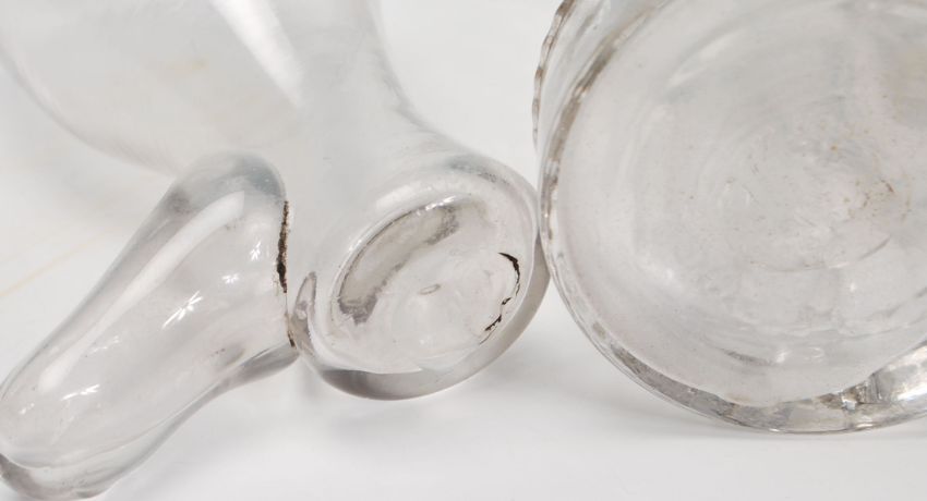 A 19th Century Georgian drink glass in the form of a boot together with a later glass decanter in the form ladies boot raised on a cobblestone moulded base. Mark to base for Depose (France). Drinking glass measures 22cm tall.