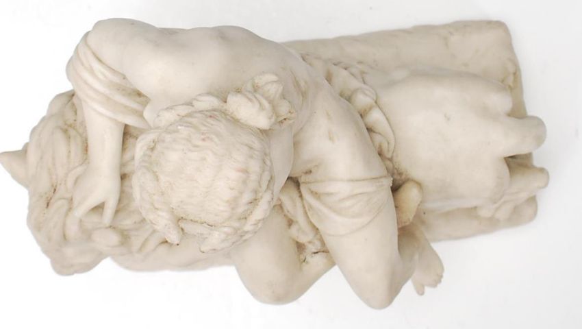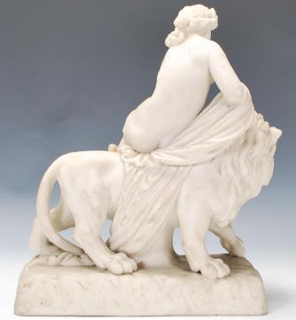 A 19th Century Parian ware sculptural figure of Una and The Lion in the manner of Minton, Una depicted sitting astride a lion covered in drapery, raised on a rectangular base. Measures 27cm tall.