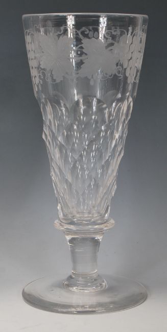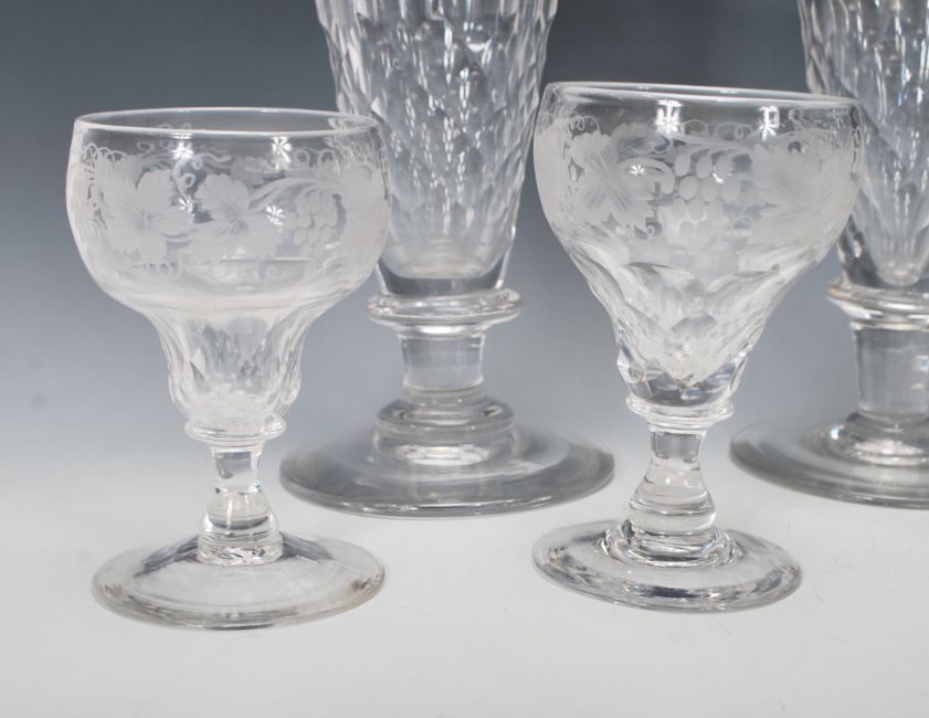 A good set of 6 acid etched 19th century sherry / port glasses. Each with circular foot having acid etched conical bowls together with a good set of 4 acid etched 19th century tall drinks glasses. Each with circular foot having acid etched tall conical bowls.