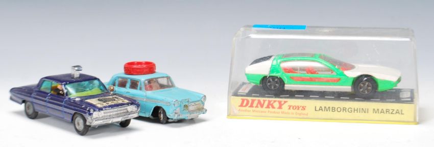 Three vintage 20th Century diecast model toy cars to include a Corgi Oldsmobile super 88 Man From U.N.C.L.E, Corgi Austin A.60 Motor School and a cased Dinky Lamborghini.