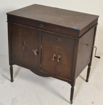 An early 20th century oak cased gramophone cabinet raised on squared legs with speaker doors to lower section, hinged top enclosing gramophone atop. Measures 85cm high x 82cm wide x 56cm deep.