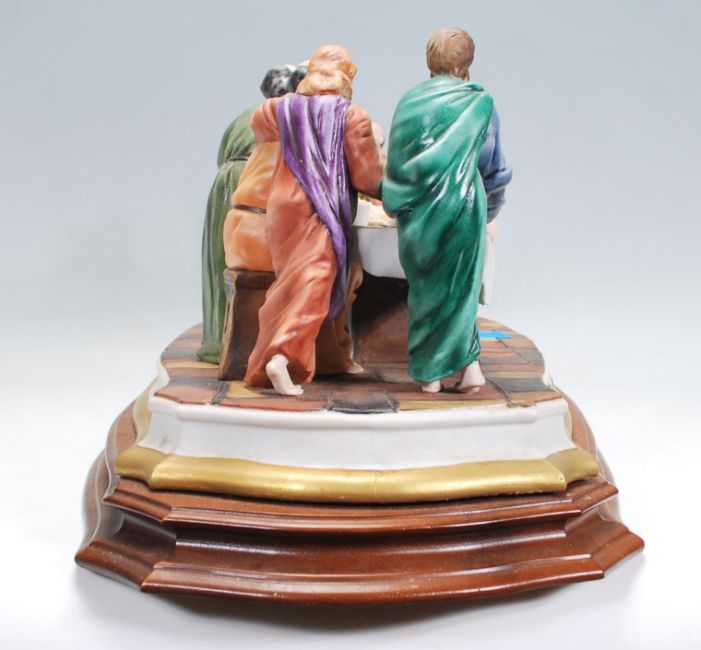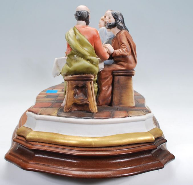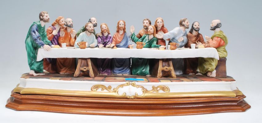 A 20th century Italian Capodimonte Ester Last Supper figurine group depicted on a wooden base with gilt scrolled decoration. Stamped Ester to the base. Measures 20cm high x 54cm wide x 25cm deep.