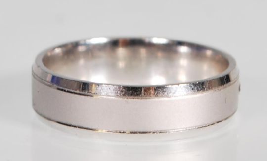 An English hallmarked 9ct white gold band ring having a central brushed section set with a round cut white stone. Hallmarked London. Weight 6.7g. Size T.