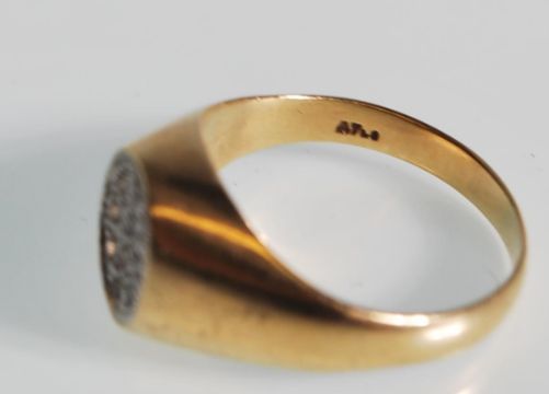 An English hallmarked 9ct gold ring having an oval head illusion set with white stones. Hallmarked London 1982. Weight 5.0g. Size Q.5.