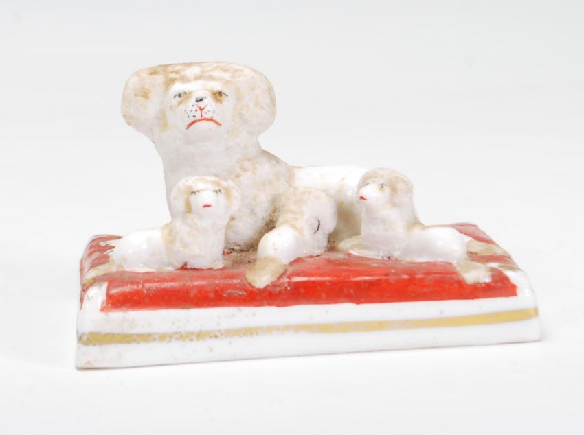 A rare 19th Century Victorian Staffordshire ceramic figurine of a poodle with a group of three puppies on red velvet cushion. Measuers 6 cm x 9cm.