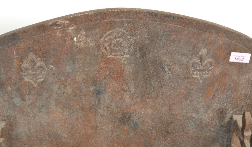 A late 19th Century Victorian cast iron fire grate with decorative fleur-de-lys detailing and scroll finials and feet having a domed back plate. Measures 51 cm x 60 cm x 30 cm.