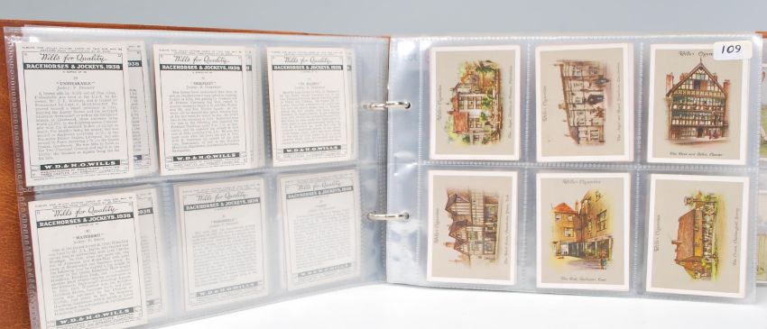 An album of vintage Wills cigarette cards to include 11 full set of large cigarette cards; Public Schools, old Pottery and Porcelain, Racehorses and Jockeys 1938, old Inns, Trees, University Hoods and Gowns, Arms of Oxford and Cambridge Colleges, Arms of Public Schools, Butterflies and Moths, Old Inns, The King's Art Treasures and 1 full set of small cigarette cards; Cricketers 2nd series.