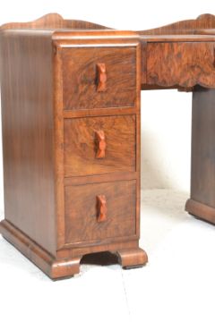 A 1930's Art Deco walnut twin pedestal office desk. Raised on plinth bases, each pedestal with an upright bank of drawers having coloured bakelite style handles with polished desk top above. Measures 78cms high x 102cms wide x 57cms deep.