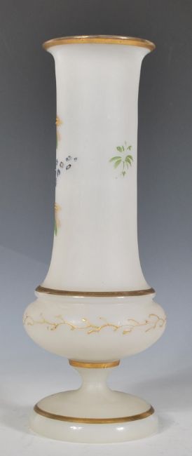 A 19th Century Victorian Bristol milk glass pedestal vase, gilt rim and detailing, the slender neck having a polychrome and gilt butterfly amongst fauna. Unsigned. Measures
