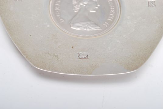A silver hallmarked pin / trinket dish bowl having decorative pierced rim. Hallmarked for Birmingham date latter E 1929, makers mark for T & J P. Weight 60g. Together with another dish of hexagonal form set with a Elizabeth II coin. Hallmarked for Birmingham date letter X, makers mark for Joseph Gloster Ltd. Gross weight 64g.
