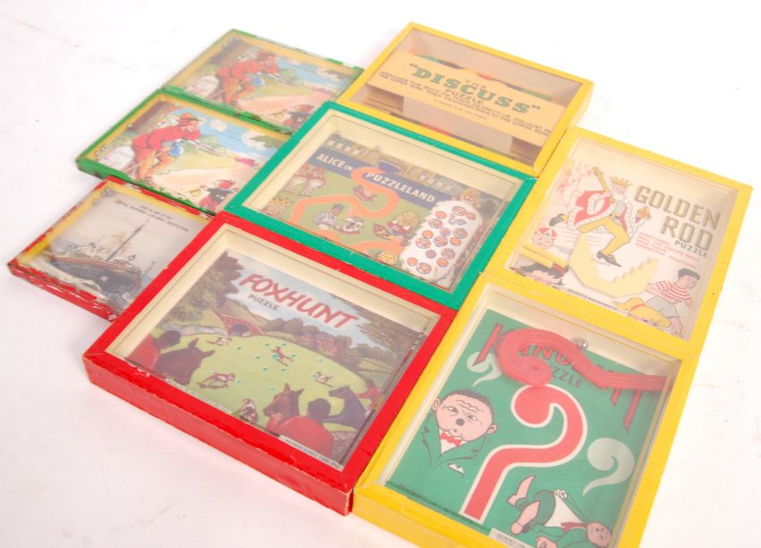A collection of 5x assorted vintage R.J. Series Of Popular Puzzles to include; Golden Rod, The Discuss Puzzle, Alice In Puzzleland, Foxhunt Puzzle and Kanuduit Puzzle along with 3x other similar puzzle games.