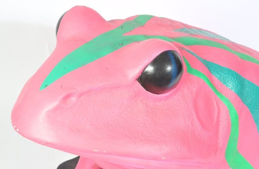 An impressive large oversized fibreglass events / exhibition / advertising display statue of a tree frog. Painted in a psychedelic colourway - neon pink, with green stripes. Incredibly well modelled, and standing on a shaped fibreglass base. Highly detailed. Measures approx; 100cm tall x 130cm long. Rare.