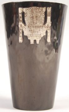 Vicky Inustria Peruana - A 20th Century Peruvian retro vintage beaten copper and silver beaker / cup having a hammered copper tapered beaker with a Mayan style designed figure / shaman to the front Makers marks to bottom and stamped 925. Measures; 12cm.
