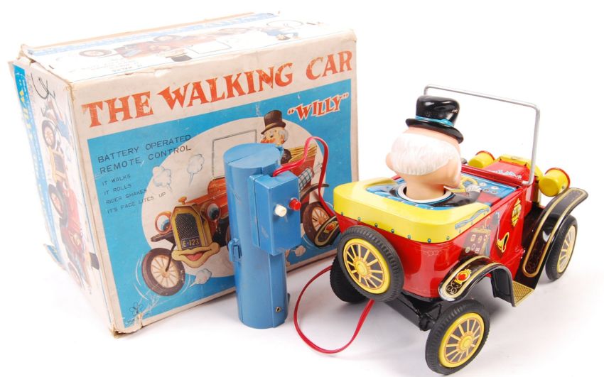 An original vintage ' Made In Japan ' battery operated tinplate ' Willy The Walking Car ' toy. Litho-printed tin construction, with a plastic figure to the seat. Within its original box, with both upper and lower sections present. Car measures approx; 21cm long.