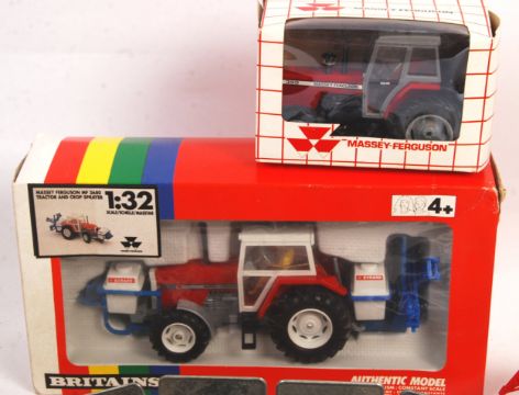 A collection of original Britains made Farm series diecast models and figures. Comprising: 9607 Massey Ferguson MF 3680 Tractor and Crop Sprayer in original box, 760 Combine Harvester, Bridge, boxed Massey Ferguson tractor and a quantity of assorted farm hands, Swoppets cowboys and animals. Good collection.