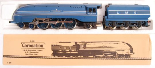 A Hornby Railways 00 gauge model railway trainset locomotive R685 ' Coronation - LMS Streamlined Express - Blue / Silver Livery '. Contents appear mint, within the original box (box a little tatty).