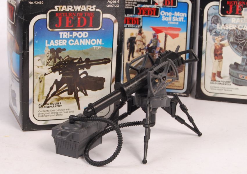 A collection of x4 original vintage Kenner / Palitoy made Star Wars action figure playsets ' Minirigs ' - all 100% complete, comprising; Tri-Pod Laser Cannon, Radar Laser Cannon, Vehicle Maintenance Energizer and a Tri-Logo One Man Sail Skiff Vehicle. All within the original boxes.