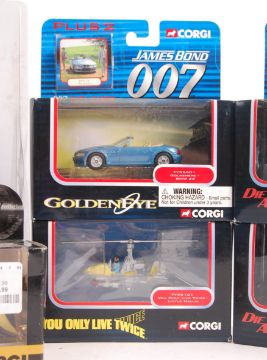 A good collection of 10x Corgi James Bond 007 diecast models. Comprising TY99132 Aston Martin & Jaguar XKR 2 Piece Set, CC06803 Goldfinger Rolls Royce III Sedanca De Ville Director's Cut, TY95601 Goldfinger Rolls Royce, TY95401 Die Another Day Jaguar XKR, TY95701 The Spy Who Loved Me Lotus Esprit Underwater,TY95101 Little Nellie, TY95301 Thunderball Aston Martin DB5, TY95501 Goldeneye BMW Z3, TY95201 Die Another Day Aston Martin Vanquish, TY95801 Moonraker Space Shuttle. All appearing mint within the original boxes.