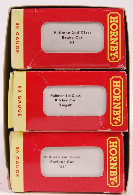A Hornby made 00 gauge model railway boxed coach set R4169 ' Bournemouth Belle Coaches '. Comprising of; 63, 66 and ' Fingall '. All appearing mint, within the original boxes and outer slipcase box.