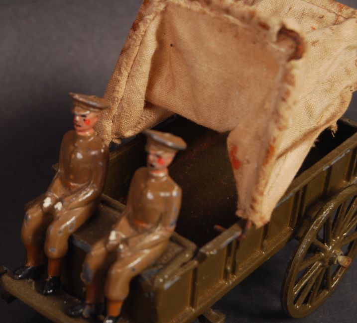 A rare early vintage WWI First World War related Britains lead soldier / figure model - ' British Royal Army Medical Corps ' RAMC horse drawn canvas backed wagon. Complete with both original riders (both slot in to the base) and the horse rider figure. Generally good - one horse missing a front leg. Rare set. Unboxed.