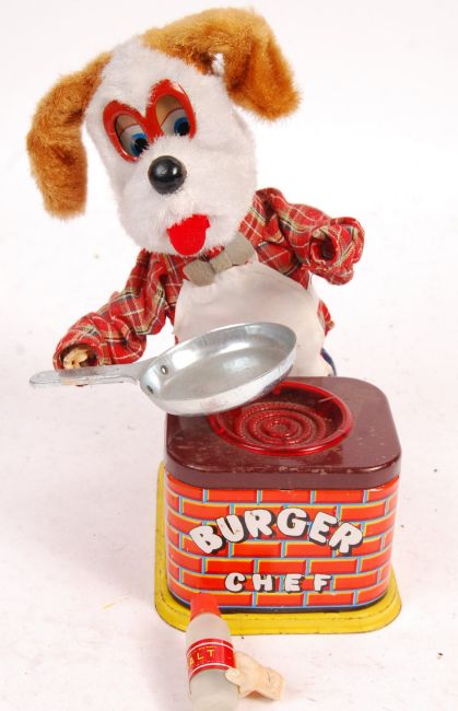 Two original vintage 1960's battery operated tin plate and plush Japanese made in Japan toys comprising a Yonezawa Burger Chef dog and an Alps made Native American Indian drummer boy. Measures: 31cm tall.