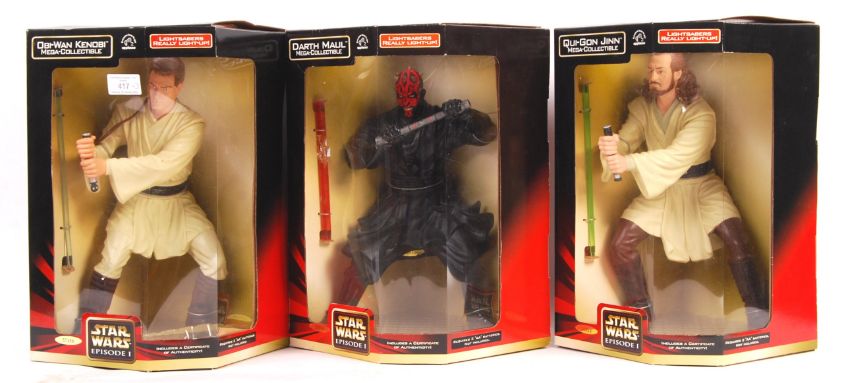 A set of x3 Hasbro made Star Wars Episode I boxed 12" scale inter-locking movable ' Mega Collectible ' action figures - Obi Wan Kenobi, Darth Maul and Qui Gon Jinn. All appearing as new and unused. Highly detailed figures.