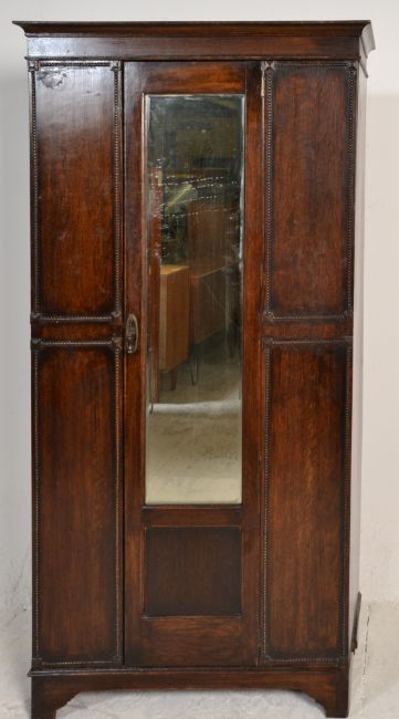 An early 20th Century Gothic revival dark oak wardrobe of good proportions having a single mirrored door with brass oval plate and handle. Beaded borders throughout and being raised on bracket feet.