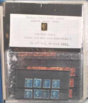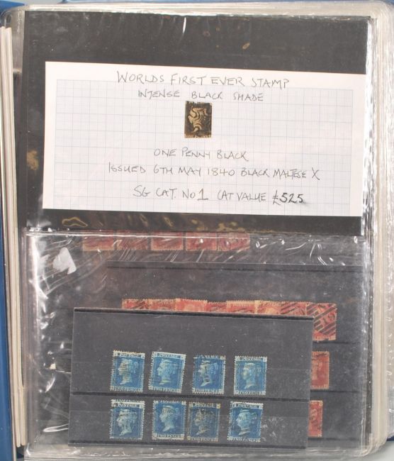 GB Victorian stamp collection with 1d Penny Black, 2d Blues (x8) 1/- Embossed, 1d Reds (x37) and (x13) on letters/envelopes. Range of Surface Printed to 1/- and GPO issued Postcards. Huge catalogue value.
