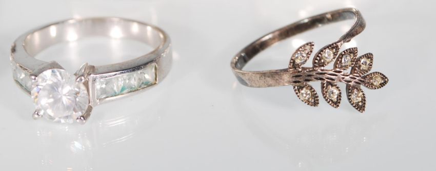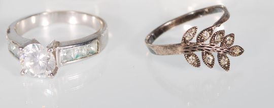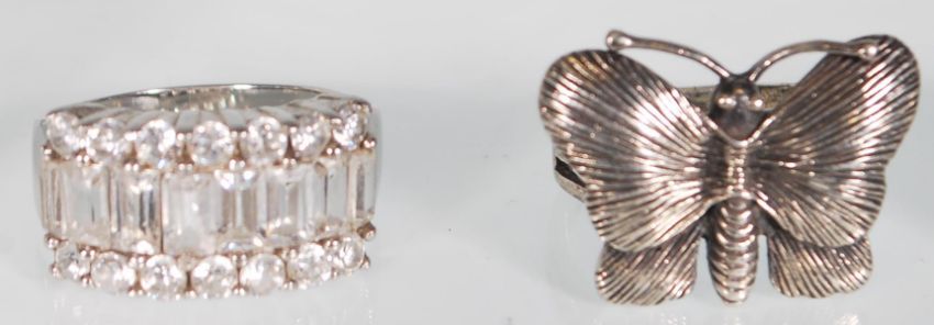 A collection of silver rings including 925 silver ring with butterfly design, a .925 silver with leaf decoration inset with white stones, a 925 silver 18K Suarti Silver ring decorated with gold geometric shapes and others. Gross weight 27g.