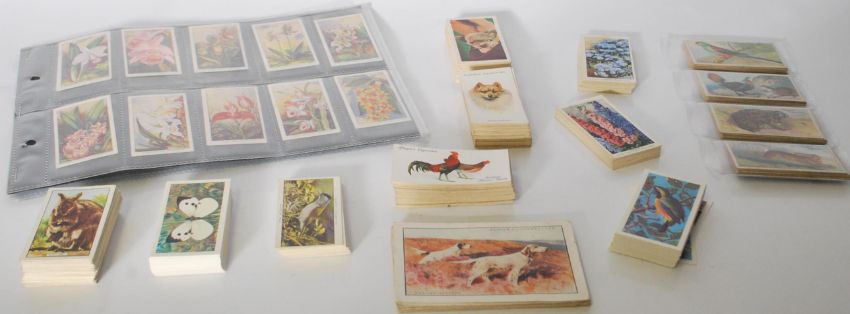 A selection of wildlife related vintage cigarette cards to include full and partial sets; John Player; Dogs (large), Poultry, Nature Series, Birds and their Young, Dogs from paintings by Arthur Wardle,  Wills; garden flowers, Gallaher; Wild Animals, Carreras; 24 Orchids etc.