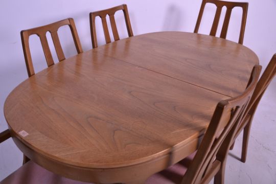 A retro 20th Century teak wood extendable dining table and matching chairs by Nathan. The oval table raised on tapering shaped supports together with a set of four and two carvers teak wood splat back dining chairs and two carvers by Nathan.